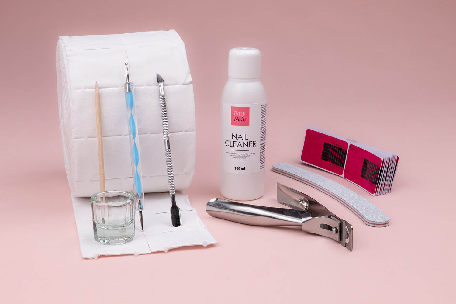 Vijl je nagels in de gewenste vorm en verwijder de glans van je nagelplaat met een polijstblok of fijne kant van een vijl. Indien nodig de nagelriem met een manicure stokje voorzichtig terugschuiven. Breng vervolgens onze Nail Cleaner aan op een nageltissue en ontvet de natuurlijke nagel grondig.
